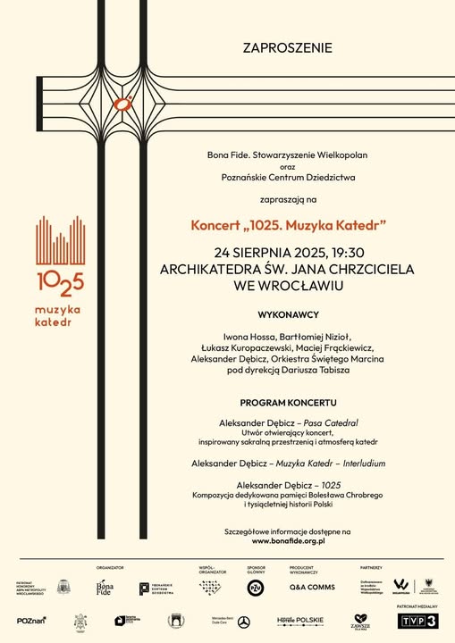 W dniach 21–26 sierpnia 2025 roku projekt 1025. Muzyka Katedr zagości w sześciu historycznych miejscach szczególnie związanych z początkiem polskiej państwowości i chrześcijaństwa. W ramach ogólnopolskiego cyklu odbędą się koncerty w najstarszych katedrach – w Kołobrzegu, Gnieźnie, Poznaniu, Wrocławiu, Krakowie i Warszawie.