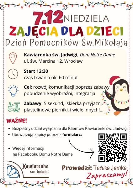 W weekend mikołajkowy, 7 grudnia,  odbędą się kolejne zajęcia dla dzieci w Kawiarence św. Jadwigi - tym razem uczestnicy wcielą się w pomocników samego Świętego Mikołaja❤️