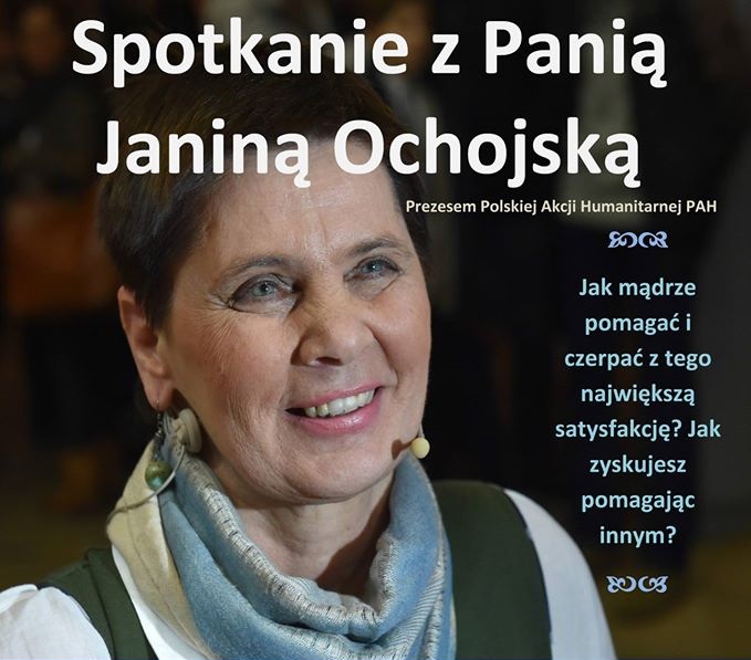 Pani Janina to osoba, która nie jedno widziała, nie jedno przeżyła i ma wiele ciekawych spraw do przekazania. Będzie mówiła o mądrej pomocy i czerpaniu satysfakcji z udzielania tej pomocy. Pomyślałam, że to zagadnienie jest dla Was bardzo aktualne, bo sami bezinteresownie pomagacie potrzebującym przez „Promyk Słońca” i inne miejsca. Usłyszymy również o działaniach i organizacji Polskiej Akcji Humanitarnej – czyli co się dzieje w terenie i jak się właściwie taki konwój wysyła.